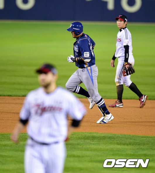 24일 오후 서울 잠실구장에서 열린 2014 한국야쿠르트 세븐 프로야구 포스트시즌 준플레이오프 3차전 LG 트윈스와 NC 다이노스의 경기, 6회초 1사에서 NC 이호준이 솔로포를 날리고 그라운드를 돌고 있다.