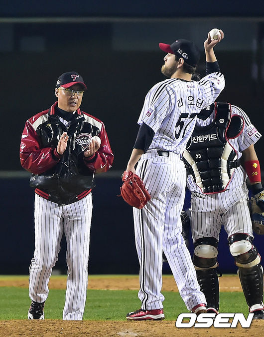 24일 오후 서울 잠실구장에서 열린 '2014 한국야쿠르트 세븐 프로야구' 포스트시즌 준플레이오프 3차전 LG 트윈스와 NC 다이노스의 경기, 6회초 1사 2루 LG 강상수 코치가 투수교체를 위해 마운드에 오르고 있다. 반격이냐, 마침표냐. 두 외국인 투수들에게 양 팀의 운명이 달렸다. NC와 LG의 준플레이오프 3차전은 이번 시리즈 처음으로 외국인 투수들이 선발 대결이다. NC는 찰리 쉬렉(29), LG는 코리 리오단(28)을 각각 3차전 선발투수로 예고했다. NC는 반격의 1승을 노리고, LG는 3연승으로 시리즈 스윕을 바라본다. NC 찰리는 실질적인 팀의 에이스. 지난해 29경기에서 189이닝을 던지며 11승7패 평균자책점 2.48로 이 부문 1위에 올라 재계약에 성공한 찰리는 2년차가 된 올해도 28경기에서 165⅓이닝을 소화하며 12승8패 평균자책점 3.81로 2년 연속 두 자릿수 승수를 올렸다. LG 리오단은 한국프로야구 데뷔 첫 해 적응기를 거쳐 연착륙했다. 28경기에서 168이닝을 던진 그는 9승10패 평균자책점 3.96으로 준수한 성적을 냈다. 비록 두 자릿수 승수에는 도달하지 못했지만, 팀 내 최다 16차례 퀄리티 스타트의 꾸준함으로 안정감을 자랑했다. / youngrae@osen.co.kr