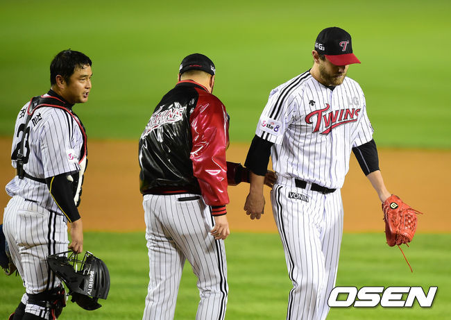 24일 오후 서울 잠실구장에서 열린 2014 한국야쿠르트 세븐 프로야구 포스트시즌 준플레이오프 3차전 LG 트윈스와 NC 다이노스의 경기, 6회초 1사 2루에서 LG 리오단이 강판당하고 있다.