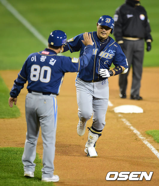 24일 오후 서울 잠실구장에서 열린 2014 한국야쿠르트 세븐 프로야구 포스트시즌 준플레이오프 3차전 LG 트윈스와 NC 다이노스의 경기, 6회초 1사에서 NC 이호준이 솔로포를 날리고 그라운드를 돌고 있다.