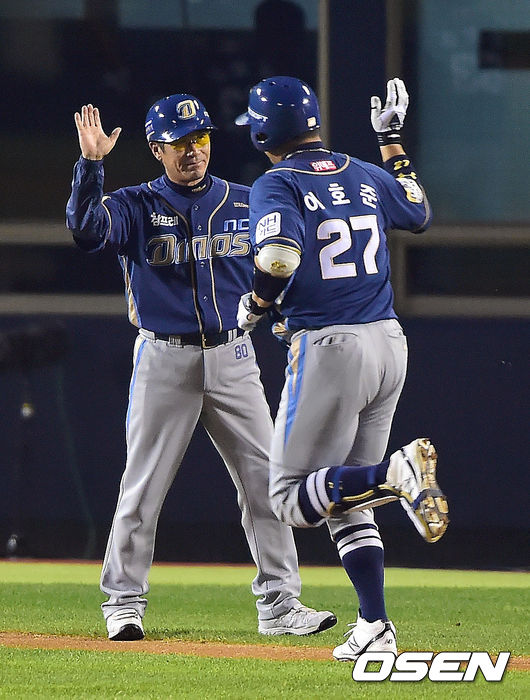 24일 오후 서울 잠실구장에서 열린 '2014 한국야쿠르트 세븐 프로야구' 포스트시즌 준플레이오프 3차전 LG 트윈스와 NC 다이노스의 경기, 6회초 1사 NC 이호준이 솔로 홈런을 때린 뒤 이광길 코치와 하이파이브를 하고 있다. 반격이냐, 마침표냐. 두 외국인 투수들에게 양 팀의 운명이 달렸다. NC와 LG의 준플레이오프 3차전은 이번 시리즈 처음으로 외국인 투수들이 선발 대결이다. NC는 찰리 쉬렉(29), LG는 코리 리오단(28)을 각각 3차전 선발투수로 예고했다. NC는 반격의 1승을 노리고, LG는 3연승으로 시리즈 스윕을 바라본다. NC 찰리는 실질적인 팀의 에이스. 지난해 29경기에서 189이닝을 던지며 11승7패 평균자책점 2.48로 이 부문 1위에 올라 재계약에 성공한 찰리는 2년차가 된 올해도 28경기에서 165⅓이닝을 소화하며 12승8패 평균자책점 3.81로 2년 연속 두 자릿수 승수를 올렸다. LG 리오단은 한국프로야구 데뷔 첫 해 적응기를 거쳐 연착륙했다. 28경기에서 168이닝을 던진 그는 9승10패 평균자책점 3.96으로 준수한 성적을 냈다. 비록 두 자릿수 승수에는 도달하지 못했지만, 팀 내 최다 16차례 퀄리티 스타트의 꾸준함으로 안정감을 자랑했다. / youngrae@osen.co.kr
