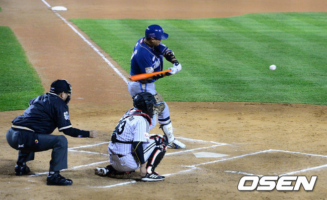 24일 오후 서울 잠실구장에서 열린 2014 한국야쿠르트 세븐 프로야구 포스트시즌 준플레이오프 3차전 LG 트윈스와 NC 다이노스의 경기, 6회초 1사에서 NC 이호준이 솔로포를 날리고 있다.