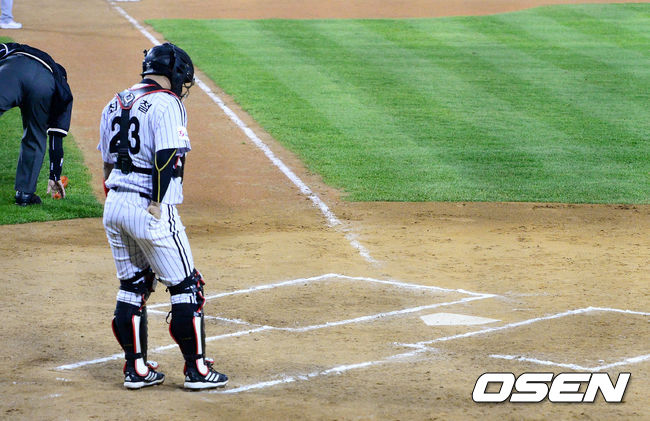 24일 오후 서울 잠실구장에서 열린 2014 한국야쿠르트 세븐 프로야구 포스트시즌 준플레이오프 3차전 LG 트윈스와 NC 다이노스의 경기, 6회초 1사에서 NC 이호준에 솔로포를 허용한 LG 최경철이 아쉬워하고 있다.