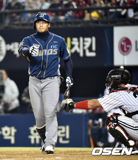 24일 오후 서울 잠실구장에서 열리는 2014 한국야쿠르트 세븐 프로야구 포스트시즌 준플레이오프 3차전 LG 트윈스와 NC 다이노스의 경기, 7회초 1사 1루 나성범이 공이 좀 빠졌다는 제스쳐를 취하고 있다.