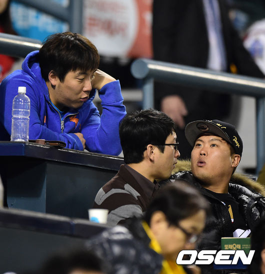 24일 오후 서울 잠실구장에서 열린 2014 한국야쿠르트 세븐 프로야구 포스트시즌 준플레이오프 3차전 LG 트윈스와 NC 다이노스의 경기, LA 다저스 류현진과 두산 김현수가 이야기를 나누며 경기를 관전하고 있다.