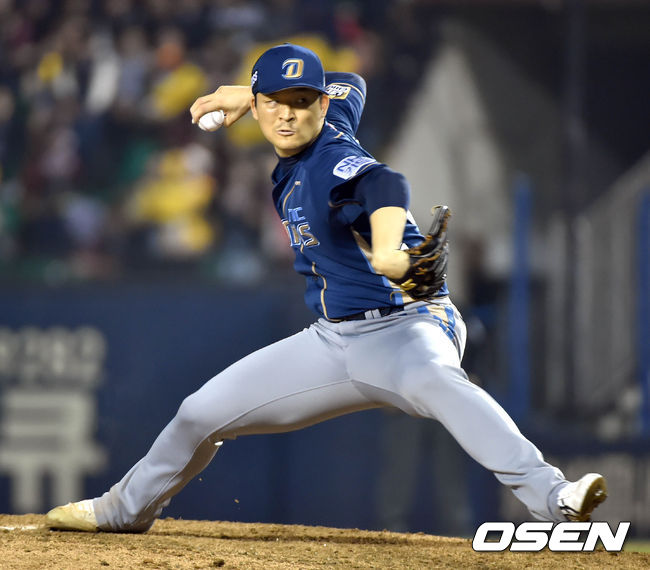 24일 오후 서울 잠실구장에서 열리는 2014 한국야쿠르트 세븐 프로야구 포스트시즌 준플레이오프 3차전 LG 트윈스와 NC 다이노스의 경기, 7회말 NC 세 번째 투수 원종현이 함치게 공을 던지고 있다.