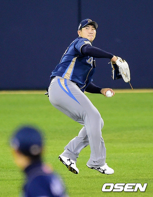 24일 오후 서울 잠실구장에서 열린 2014 한국야쿠르트 세븐 프로야구 포스트시즌 준플레이오프 3차전 LG 트윈스와 NC 다이노스의 경기, 5회말 무사 1,3루에서 NC 나성범이 LG 이병규의 중견수 플라이를 잡아 홈으로 송구, 태그업한 3루주자 오지환을 잡아내고 있다.