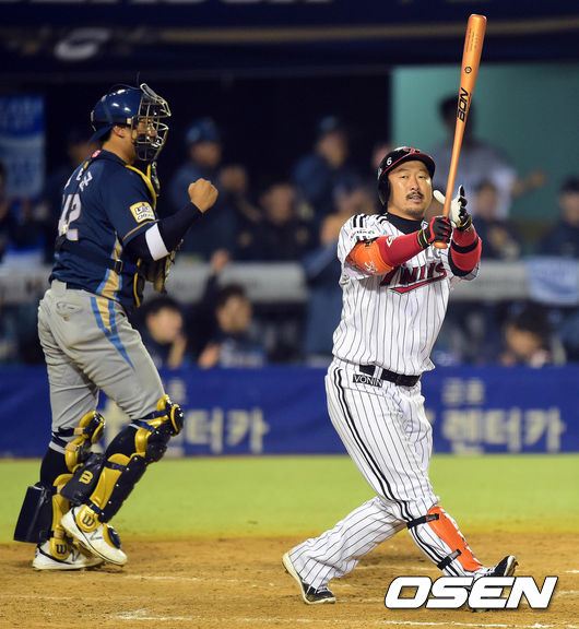 24일 오후 서울 잠실구장에서 열린 2014 한국야쿠르트 세븐 프로야구 포스트시즌 준플레이오프 3차전 LG 트윈스와 NC 다이노스의 경기 7회말 1사 1,2루 이병규가 삼진을 당하고 있다.