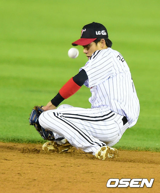 24일 오후 서울 잠실구장에서 열린 2014 한국야쿠르트 세븐 프로야구 포스트시즌 준플레이오프 3차전 LG 트윈스와 NC 다이노스의 경기, 8회초 무사에서 LG 김용의가 NC 권희동의 2루 땅볼 타구를 놓치고 있다.