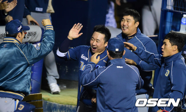 24일 오후 서울 잠실구장에서 열린 2014 한국야쿠르트 세븐 프로야구 포스트시즌 준플레이오프 3차전 LG 트윈스와 NC 다이노스의 경기, 8회초 2사 3루에서 1타점 적시타를 날린 NC 김태군이 공격을 마치고 동료선수들과 하이파이브를 하고 있다.