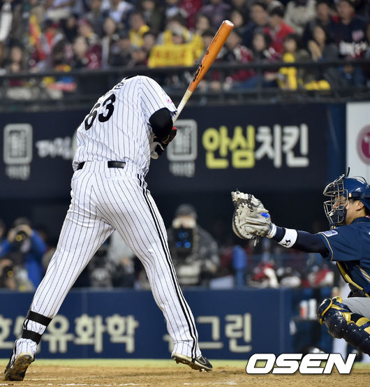 24일 오후 서울 잠실구장에서 열리는 2014 한국야쿠르트 세븐 프로야구 포스트시즌 준플레이오프 3차전 LG 트윈스와 NC 다이노스의 경기, 8회말 무사 1루 최승준이 볼넷을 골라내고 있다.