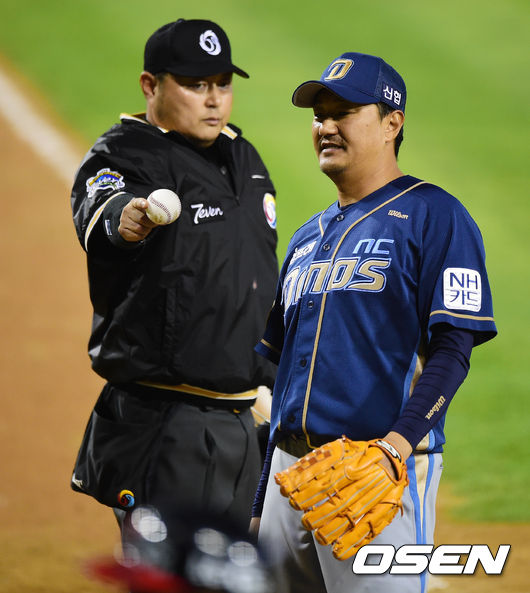 24일 오후 서울 잠실구장에서 열린 2014 한국야쿠르트 세븐 프로야구 포스트시즌 준플레이오프 3차전 LG 트윈스와 NC 다이노스의 경기, 8회말 1사 2,3루에서 NC 손민한이 폭투로 실점하며 아쉬워하고 있다.