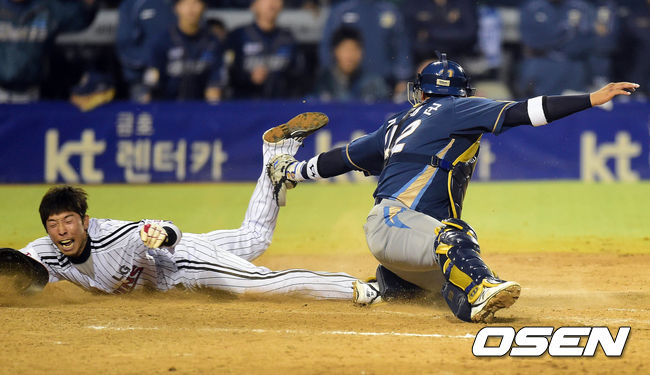 24일 오후 서울 잠실구장에서 열린 2014 한국야쿠르트 세븐 프로야구 포스트시즌 준플레이오프 3차전 LG 트윈스와 NC 다이노스의 경기 8회말 1사 3루 대타 이병규의 내야땅볼, 3루주자 황목치승이 홈에서 아웃 당하고 있다.