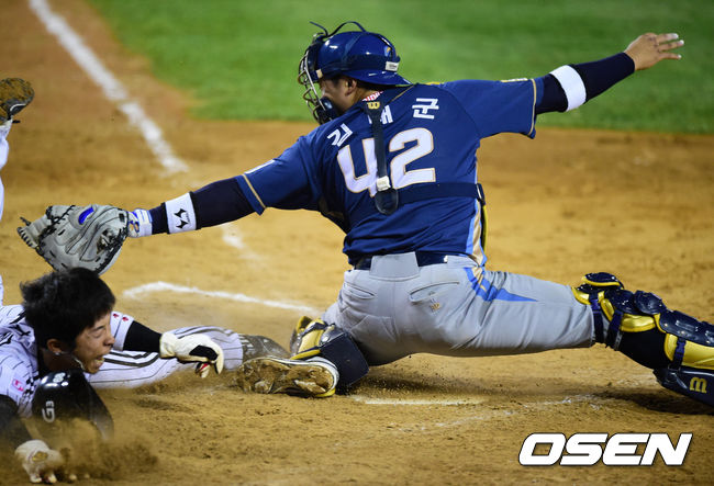 24일 오후 서울 잠실구장에서 열린 2014 한국야쿠르트 세븐 프로야구 포스트시즌 준플레이오프 3차전 LG 트윈스와 NC 다이노스의 경기, 8회말 1사 3루에서 LG 황목치승이 이병규의 2루 땅볼에 홈에서 NC 김태군에 태그아웃 당하고 있다.