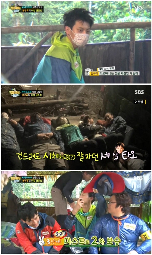 이날 김규리는 뒤늦게 일어난 타오에게 "너는 정글 체질인 것 같다. 잘 때 건드렸는데도 꿈쩍도 하지 않고 자더라"고 말했다. 타오는 "피곤해서 그런 것 같다"며 가방에서 물티슈를 찾아 얼굴을 닦고 미스트로 보습을 보충했다.