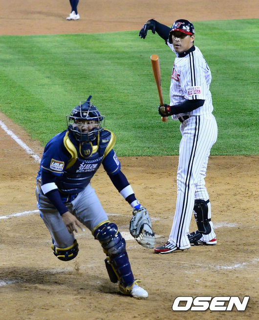 24일 오후 서울 잠실구장에서 열린 2014 한국야쿠르트 세븐 프로야구 포스트시즌 준플레이오프 3차전 LG 트윈스와 NC 다이노스의 경기, 8회말 1사 2,3루에서 NC 손민한이 LG 이병규 타석에 폭투를 범하고 있다.