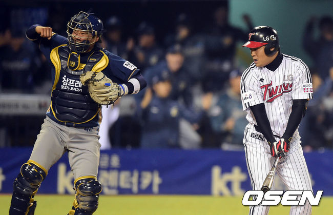 24일 오후 서울 잠실구장에서 열린 2014 한국야쿠르트 세븐 프로야구 포스트시즌 준플레이오프 3차전 LG 트윈스와 NC 다이노스의 경기 9회말 대타 정의윤이 삼진을 당하자 김태군이 기뻐하고 있다.