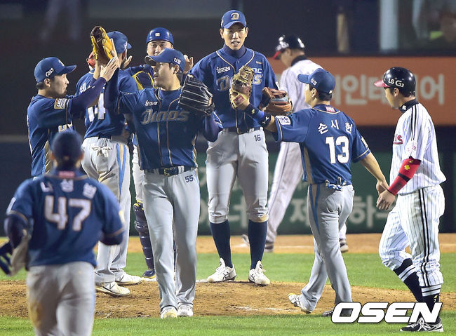 NC가 적지에서 1승을 거두며 반격에 성공했다. NC는 24일 서울 잠실구장에서 벌어진 '2014 한국야쿠트르 세븐 프로야구' LG와의 준 플레이오프 3차전에서 이호준의 결승포를 앞세워 4-3으로 승리를 거뒀다. 홈에서 2연패를 당했던 NC는 잠실 첫 경기에서 승리를 거두고 반격에 시동을 걸었다. 승리를 거둔 NC 선수들이 기뻐하고 있다. / youngrae@osen.co.kr