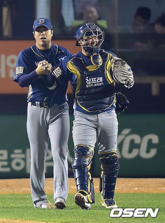 NC가 적지에서 1승을 거두며 반격에 성공했다. NC는 24일 서울 잠실구장에서 벌어진 '2014 한국야쿠트르 세븐 프로야구' LG와의 준 플레이오프 3차전에서 이호준의 결승포를 앞세워 4-3으로 승리를 거뒀다. 홈에서 2연패를 당했던 NC는 잠실 첫 경기에서 승리를 거두고 반격에 시동을 걸었다. 승리를 거둔 NC 김태군과 김진성이 기뻐하고 있다. / youngrae@osen.co.kr