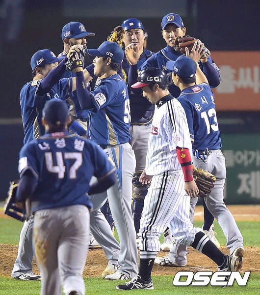 NC가 적지에서 1승을 거두며 반격에 성공했다. NC는 24일 서울 잠실구장에서 벌어진 '2014 한국야쿠트르 세븐 프로야구' LG와의 준 플레이오프 3차전에서 이호준의 결승포를 앞세워 4-3으로 승리를 거뒀다. 홈에서 2연패를 당했던 NC는 잠실 첫 경기에서 승리를 거두고 반격에 시동을 걸었다. 승리를 거둔 NC 선수들이 기뻐하고 있다. / youngrae@osen.co.kr