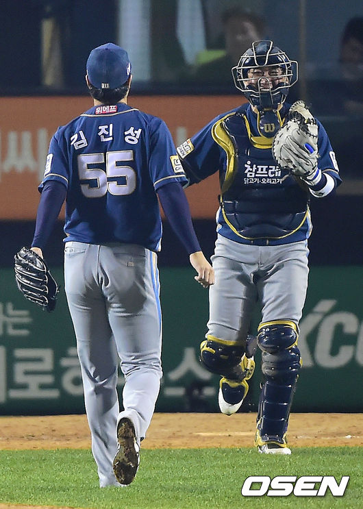 NC가 적지에서 1승을 거두며 반격에 성공했다. NC는 24일 서울 잠실구장에서 벌어진 '2014 한국야쿠트르 세븐 프로야구' LG와의 준 플레이오프 3차전에서 이호준의 결승포를 앞세워 4-3으로 승리를 거뒀다. 홈에서 2연패를 당했던 NC는 잠실 첫 경기에서 승리를 거두고 반격에 시동을 걸었다. 승리를 거둔 NC 김태군이 기뻐하고 있다. / youngrae@osen.co.kr
