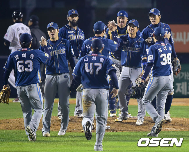 NC가 적지에서 1승을 거두며 반격에 성공했다. NC는 24일 서울 잠실구장에서 벌어진 '2014 한국야쿠트르 세븐 프로야구' LG와의 준 플레이오프 3차전에서 이호준의 결승포를 앞세워 4-3으로 승리를 거뒀다. 홈에서 2연패를 당했던 NC는 잠실 첫 경기에서 승리를 거두고 반격에 시동을 걸었다. 승리를 거둔 NC 선수들이 기뻐하고 있다. / youngrae@osen.co.kr