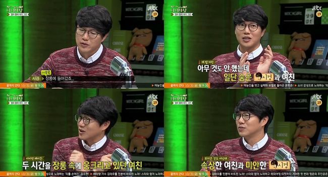 그는 이날 '자신을 감시하는 어머니때문에 고민'이라는 사연을 듣고는 "나는 집에 있을 때 여자친구와 있다가 부모님이 오셔서 장롱 속으로 들어갔다. 뭐라도 했으면 안 억울할텐데 아무것도 안하고 있었는데 놀라서 장롱 속으로 피했다"고 말했다.