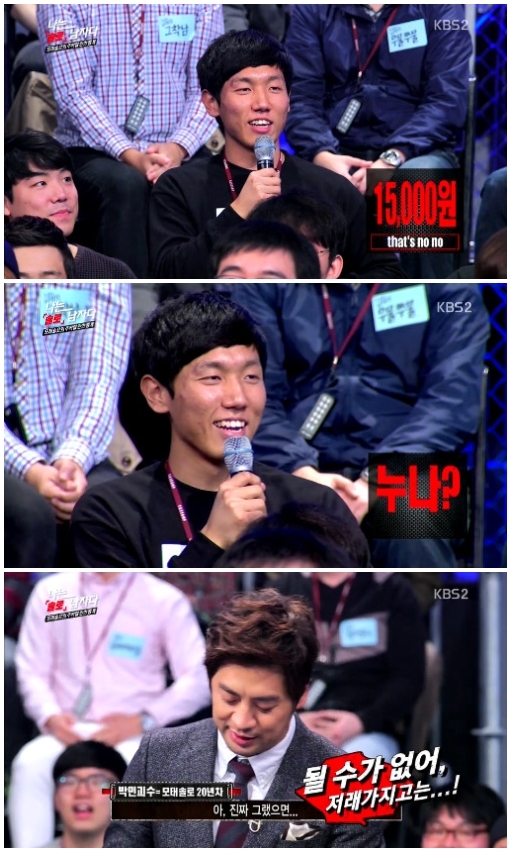 이날 '박민괴수'란 닉네임을 지닌, 지난 파일럿 방송 당시 화제가 된 이른바 대전지하상가남이 등장했다. 이번에는 홍대에서 산 상의를 자랑했다. 모태솔로로 출연한 박민괴수는 좋아하는 누나가 있음을 고백했다. 좋아하는 누나와 함께 무엇을 하고 싶으냐는 MC 유재석의 질문에 횡설수설을 했고, 답답한 이야기 전개에 권오중은 폭발하고 말았다. 허경환은 "보고싶다"라는 휴대전화 메시지를 보내보라고 권했고, 박민괴수는 "'읽씹'(무시) 당한다"고 말해 웃음을 자아냈다.