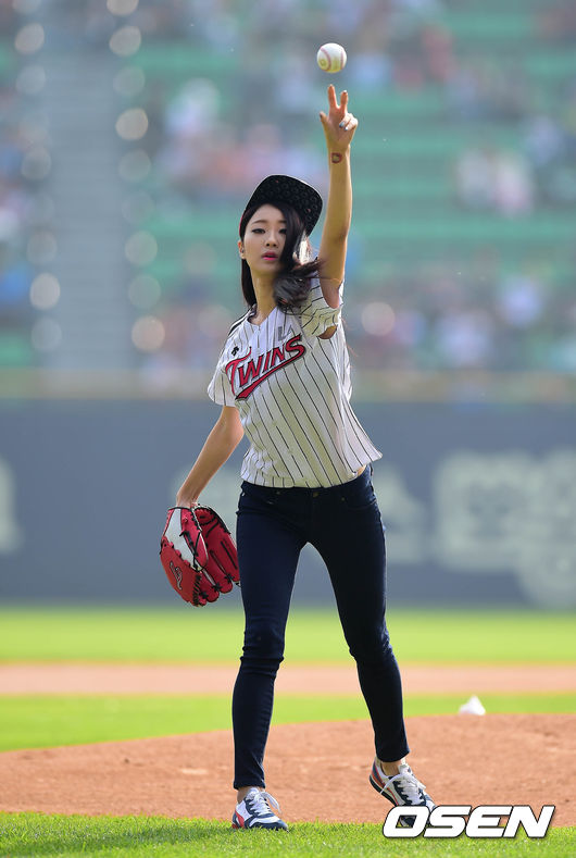 25일 오후 서울 잠실구장에서 열린 2014 한국야쿠르트 세븐 프로야구 포스트시즌 준플레이오프 4차전 LG 트윈스와 NC 다이노스의 경기 시작전 경리가 시구를 하고 있다.