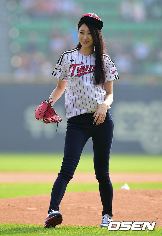 25일 오후 서울 잠실구장에서 열린 2014 한국야쿠르트 세븐 프로야구 포스트시즌 준플레이오프 4차전 LG 트윈스와 NC 다이노스의 경기 시작전 경리가 시구를 하고 미소를 짓고 있다.