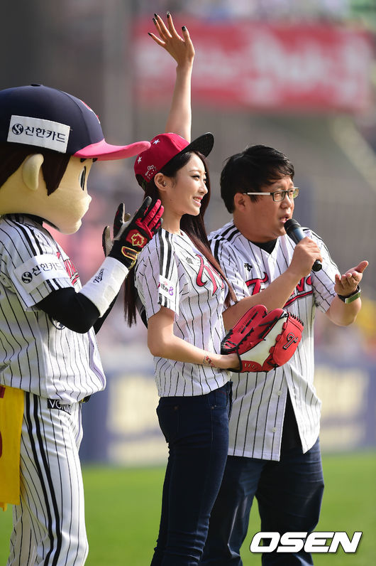 25일 오후 서울 잠실구장에서 열린 2014 한국야쿠르트 세븐 프로야구 포스트시즌 준플레이오프 4차전 LG 트윈스와 NC 다이노스의 경기 시작전 시구자로 나선 경리가 관중들에게 인사를 하고 있다.