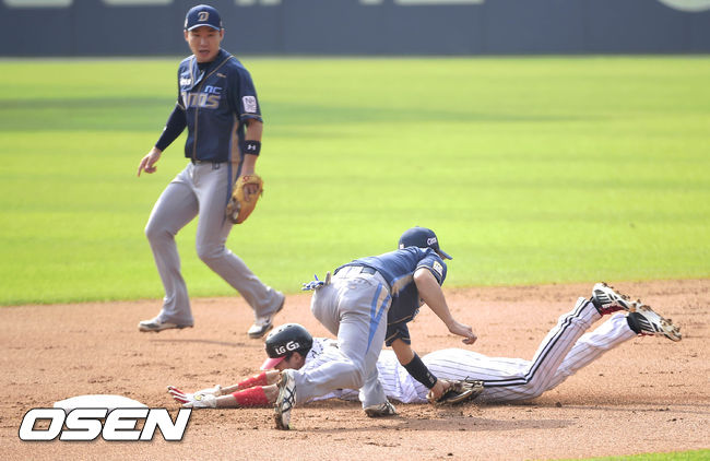 25일 오후 서울 잠실구장에서 열리는 2014 한국야쿠르트 세븐 프로야구 포스트시즌 준플레이오프 4차전 LG 트윈스와 NC 다이노스의 경기,1회말 1사 주자 1루, 1루주자 LG 김용의가 박용택 타석에 2루 도루를 시도하다 아웃당하고 있다.