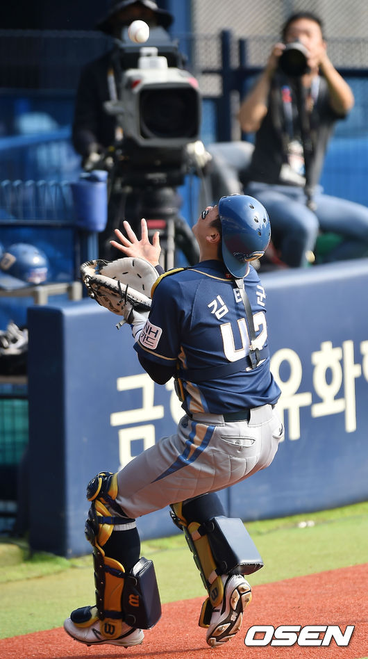 25일 오후 서울 잠실구장에서 열린 2014 한국야쿠르트 세븐 프로야구 포스트시즌 준플레이오프 4차전 LG 트윈스와 NC 다이노스의 경기,2회말 무사 주자 만루 LG 오지환의 타구를 NC 김태군 포수가 달려가 잡아내고 있다.
