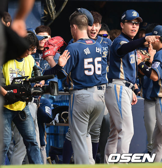 25일 오후 서울 잠실구장에서 열린 2014 한국야쿠르트 세븐 프로야구 포스트시즌 준플레이오프 4차전 LG 트윈스와 NC 다이노스의 경기 2회말 1사 만루 최경철을 병살로 처리한 웨버가 덕아웃으로 향하며 동료들과 하이파이브를 하고 있다.