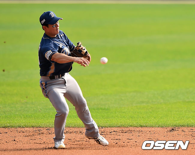 25일 오후 서울 잠실구장에서 열린 2014 한국야쿠르트 세븐 프로야구 포스트시즌 준플레이오프 4차전 LG 트윈스와 NC 다이노스의 경기,2회말 1사 주자 만루 LG 최경철의 유격수 병살타때 NC 유격수 손시헌이 병살 처리를 하고 있다.