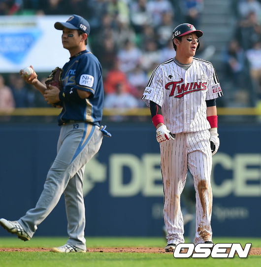 25일 오후 서울 잠실구장에서 열린 2014 한국야쿠르트 세븐 프로야구 포스트시즌 준플레이오프 4차전 LG 트윈스와 NC 다이노스의 경기 3회말 무사 1,2루 김용의 타석, 2루주자 손주인이 견제사아웃을 당하고 덕아웃으로 향하고 있다.