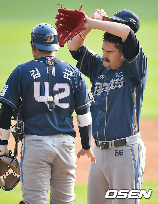25일 오후 서울 잠실구장에서 열린 2014 한국야쿠르트 세븐 프로야구 포스트시즌 준플레이오프 4차전 LG 트윈스와 NC 다이노스의 경기,3회말 1사 주자 1,2루 LG 박용택 타석에서 NC 김태군이 선발 웨버에게 다가가 얘기를 나누고 있다.