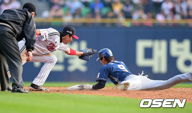 25일 오후 서울 잠실구장에서 열린 2014 한국야쿠르트 세븐 프로야구 포스트시즌 준플레이오프 4차전 LG 트윈스와 NC 다이노스의 경기 5회초 2사 1루 모창민 타석, 1루주자 김종호가 도루에 성공하고 있다.