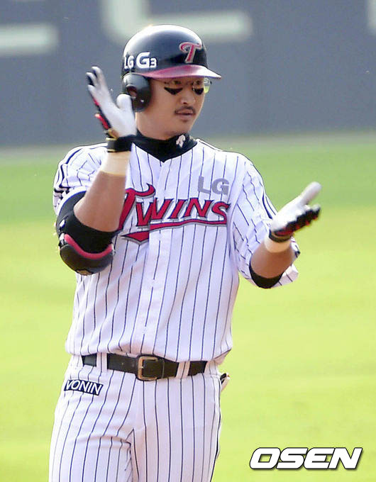 25일 오후 서울 잠실구장에서 열리는 2014 한국야쿠르트 세븐 프로야구 포스트시즌 준플레이오프 4차전 LG 트윈스와 NC 다이노스의 경기, 5회말 1사 주자 2루, LG 박용택이 1타점 2루타를 치고 2루에서 기뻐하고 있다.
