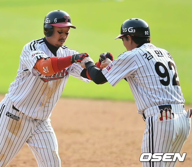 25일 오후 서울 잠실구장에서 열린 2014 한국야쿠르트 세븐 프로야구 포스트시즌 준플레이오프 4차전 LG 트윈스와 NC 다이노스의 경기,5회말 2사 주자 2루 LG 이병규가 좌익수 오른쪽 1타점 적시타를 날린 후 1루에서 김민호 코치와 하이파이브를 하고 있다.