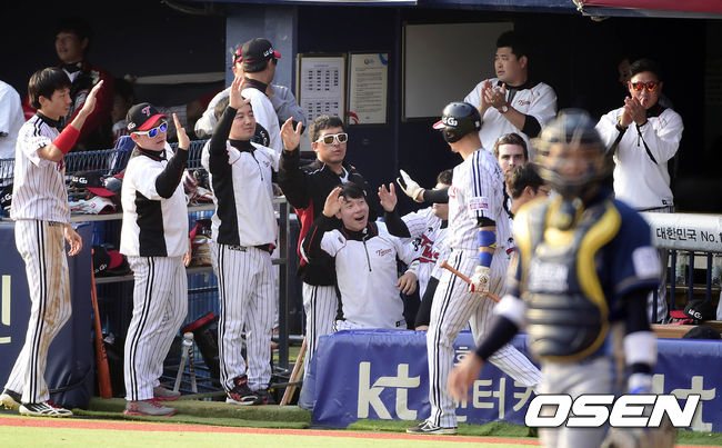 25일 오후 서울 잠실구장에서 열리는 2014 한국야쿠르트 세븐 프로야구 포스트시즌 준플레이오프 4차전 LG 트윈스와 NC 다이노스의 경기, 5회말 1사 주자 2루, LG 박용택의 1타점 2루타에 홈을 밟은 정성훈이 더그아웃에서 기쁨을 나누고 있다.