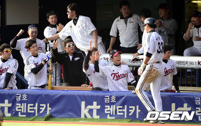 25일 오후 서울 잠실구장에서 열리는 2014 한국야쿠르트 세븐 프로야구 포스트시즌 준플레이오프 4차전 LG 트윈스와 NC 다이노스의 경기, 5회말 1사 주자 2루, LG 이병규의 안타에 홈을 밟은 2루주자 박용택이 더그아웃에서 기쁨을 나누고 있다.