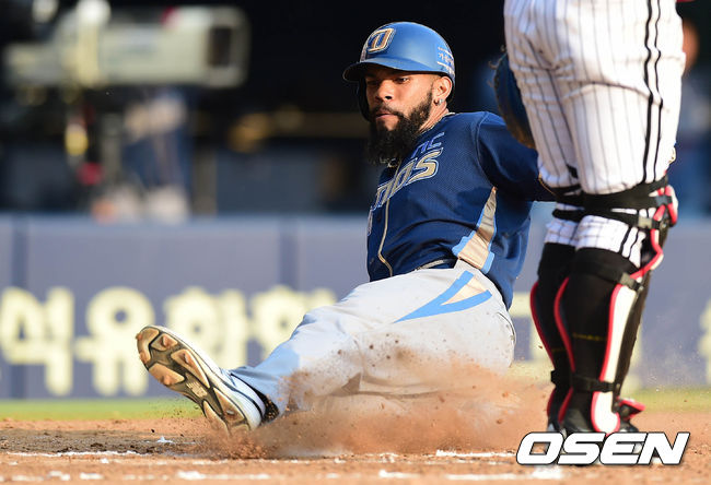 25일 오후 서울 잠실구장에서 열린 2014 한국야쿠르트 세븐 프로야구 포스트시즌 준플레이오프 4차전 LG 트윈스와 NC 다이노스의 경기 6회초 무사 1루 이호준의 1타점 2루타에 테임즈가 득점하고 있다.