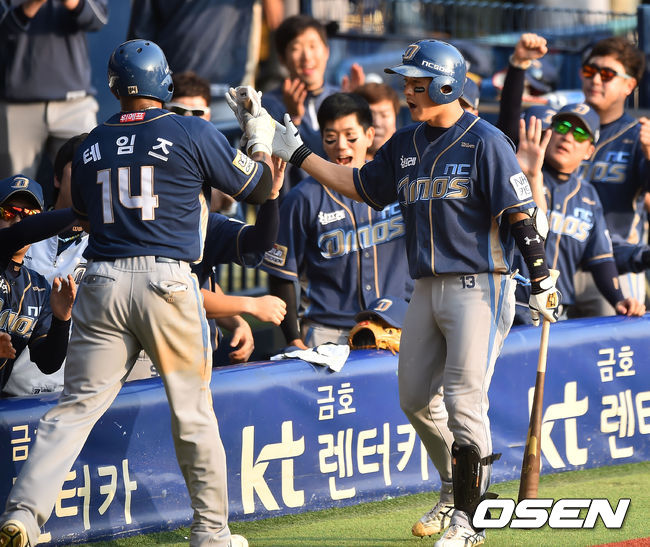 25일 오후 서울 잠실구장에서 열린 2014 한국야쿠르트 세븐 프로야구 포스트시즌 준플레이오프 4차전 LG 트윈스와 NC 다이노스의 경기,6회초 1사 주자 1루 NC 이호준의 좌익수 왼쪽 1타점 적시타때 홈을 밟은 테임즈가 덕아웃에서 동료들과 하이파이브를 하고 있다.
