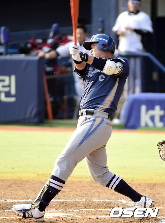 25일 오후 서울 잠실구장에서 열리는 2014 한국야쿠르트 세븐 프로야구 포스트시즌 준플레이오프 4차전 LG 트윈스와 NC 다이노스의 경기, 6회초 무사 주자 1루, LG 이호준이 1루주자 테임즈를 불러들이는 2루타를 치고 있다.