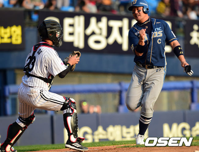 25일 오후 서울 잠실구장에서 열린 2014 한국야쿠르트 세븐 프로야구 포스트시즌 준플레이오프 4차전 LG 트윈스와 NC 다이노스의 경기 6회초 1사 3루 손시헌의 투수앞 땅볼 상황, 홈으로 쇄도하던 이호준이 태그아웃 당하고 있다.