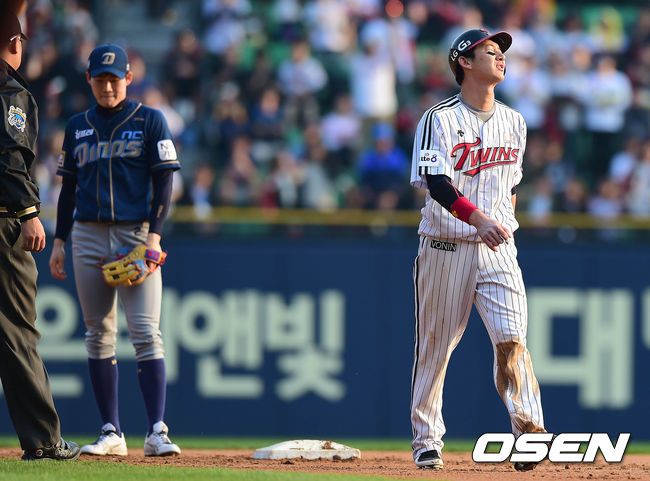25일 오후 서울 잠실구장에서 열린 2014 한국야쿠르트 세븐 프로야구 포스트시즌 준플레이오프 4차전 LG 트윈스와 NC 다이노스의 경기 6회말 1사 2루 손주인이 1타점 적시타를 치고 2루까지 쇄도하다 아웃당하고 아쉬운 표정을 짓고 있다. 2루주자 오지환 득점.