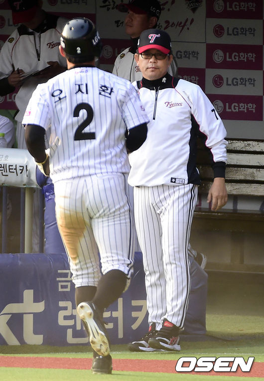 25일 오후 서울 잠실구장에서 열리는 2014 한국야쿠르트 세븐 프로야구 포스트시즌 준플레이오프 4차전 LG 트윈스와 NC 다이노스의 경기, 6회말 1사 주자 2루, LG 손주인의 안타에 홈을 밟은 오지환이 더그아웃으로 들어가고 있다.