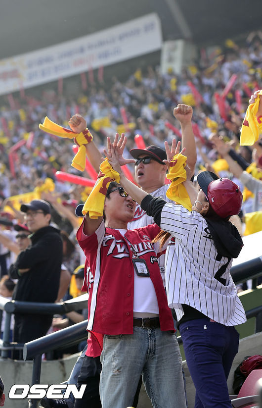 25일 오후 서울 잠실구장에서 열리는 2014 한국야쿠르트 세븐 프로야구 포스트시즌 준플레이오프 4차전 LG 트윈스와 NC 다이노스의 경기, 경기중 LG 의 득점에 팬들이 환호하고 있다.