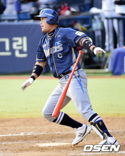 25일 오후 서울 잠실구장에서 열리는 2014 한국야쿠르트 세븐 프로야구 포스트시즌 준플레이오프 4차전 LG 트윈스와 NC 다이노스의 경기, 7회초 2사 주자 만루, NC 이호준이 2타점 2루타를 치고 있다.